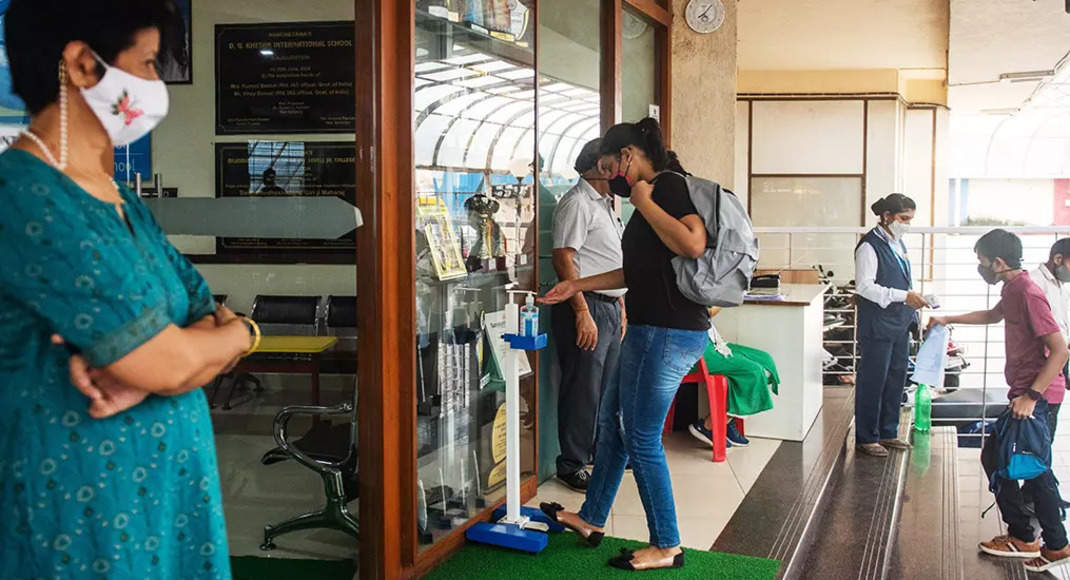 A security staff checks the temperature of a student as schools in Maharashtra reopen after being shut for over a year on October 4, 2021, in Mumbai, India.
