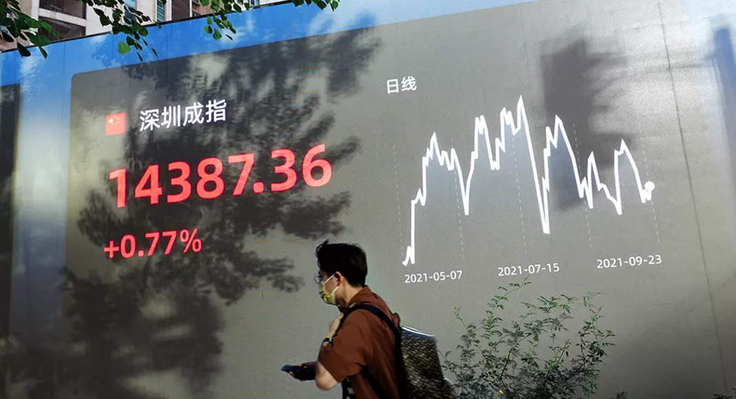 A man walks past an electronic screen displaying the Shenzhen Component Index in the street on September 23, 2021 in Shanghai, China.