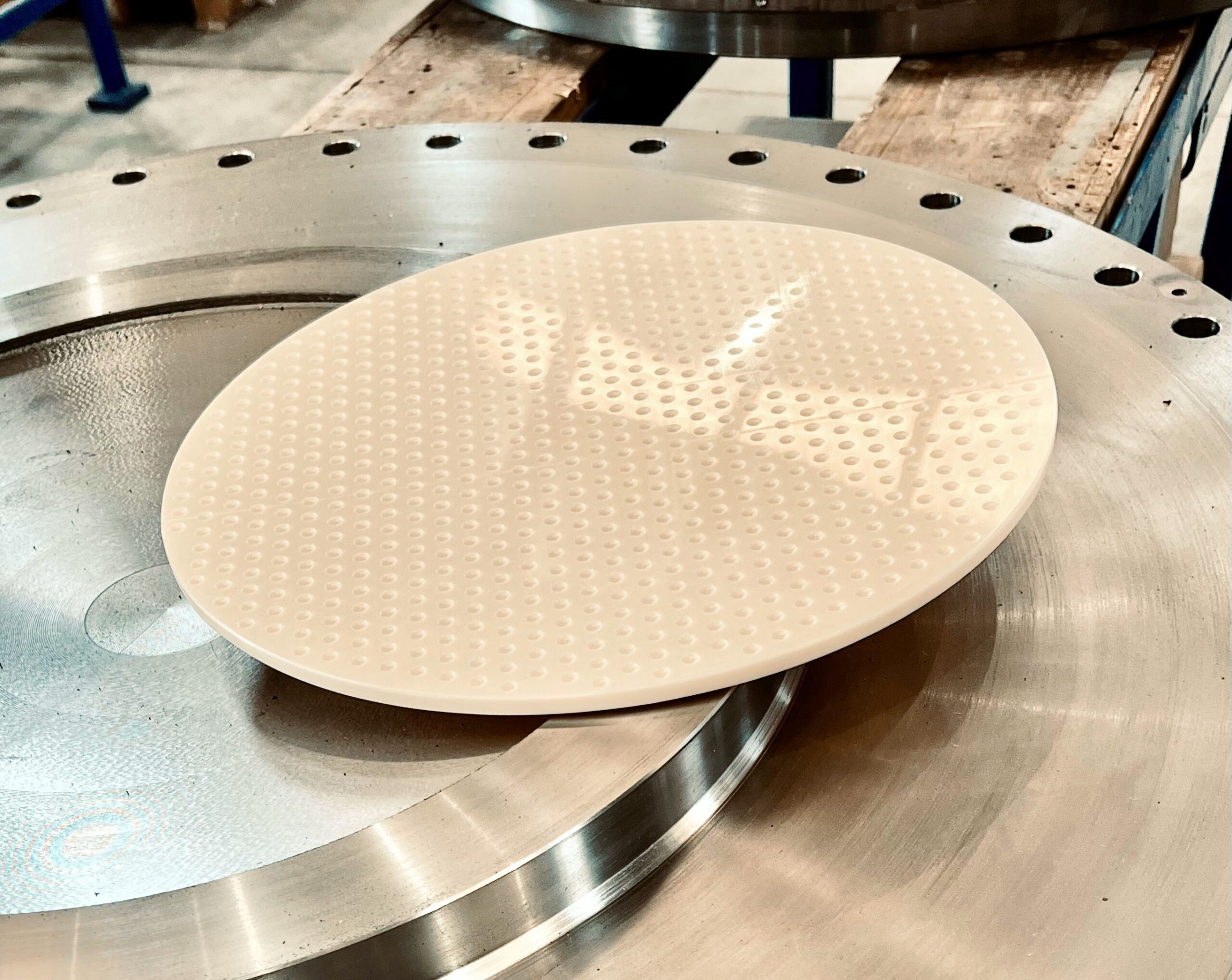 The base sheet with a thickness of 8 mm ± 0.2 mm is manufactured on a horizontal calender-extruder system by the fabricator SIMONA, in Kirn, Germany. MK4 produces the finished product by cutting the sliding bearing sheets to size and drilling recesses for oil lubrication.